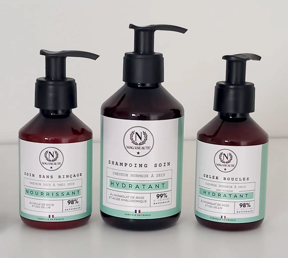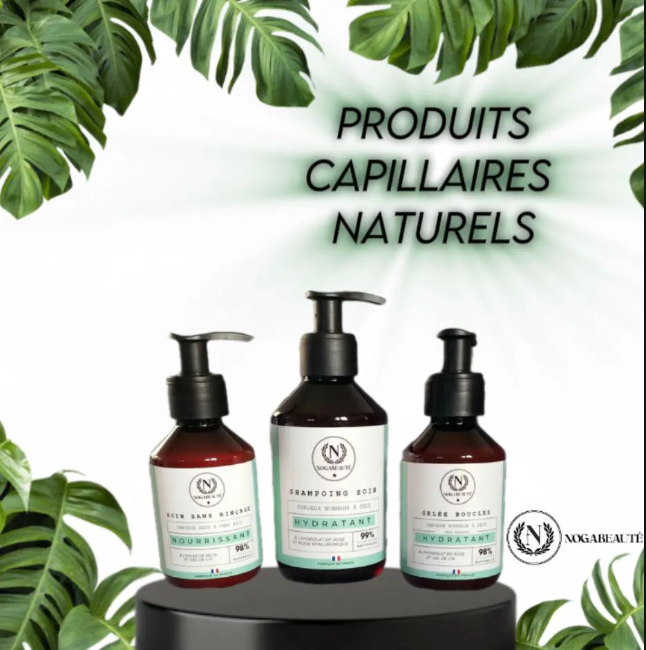 Le lot de produits capillaires naturels Nogabeauté réunit un shampoing, une gelée boucles et une huile de soin sans rinçage pour une routine complète, naturelle et efficace. Fabriqués en France, ces soins conviennent aux femmes et aux hommes et subliment les cheveux jour après jour.