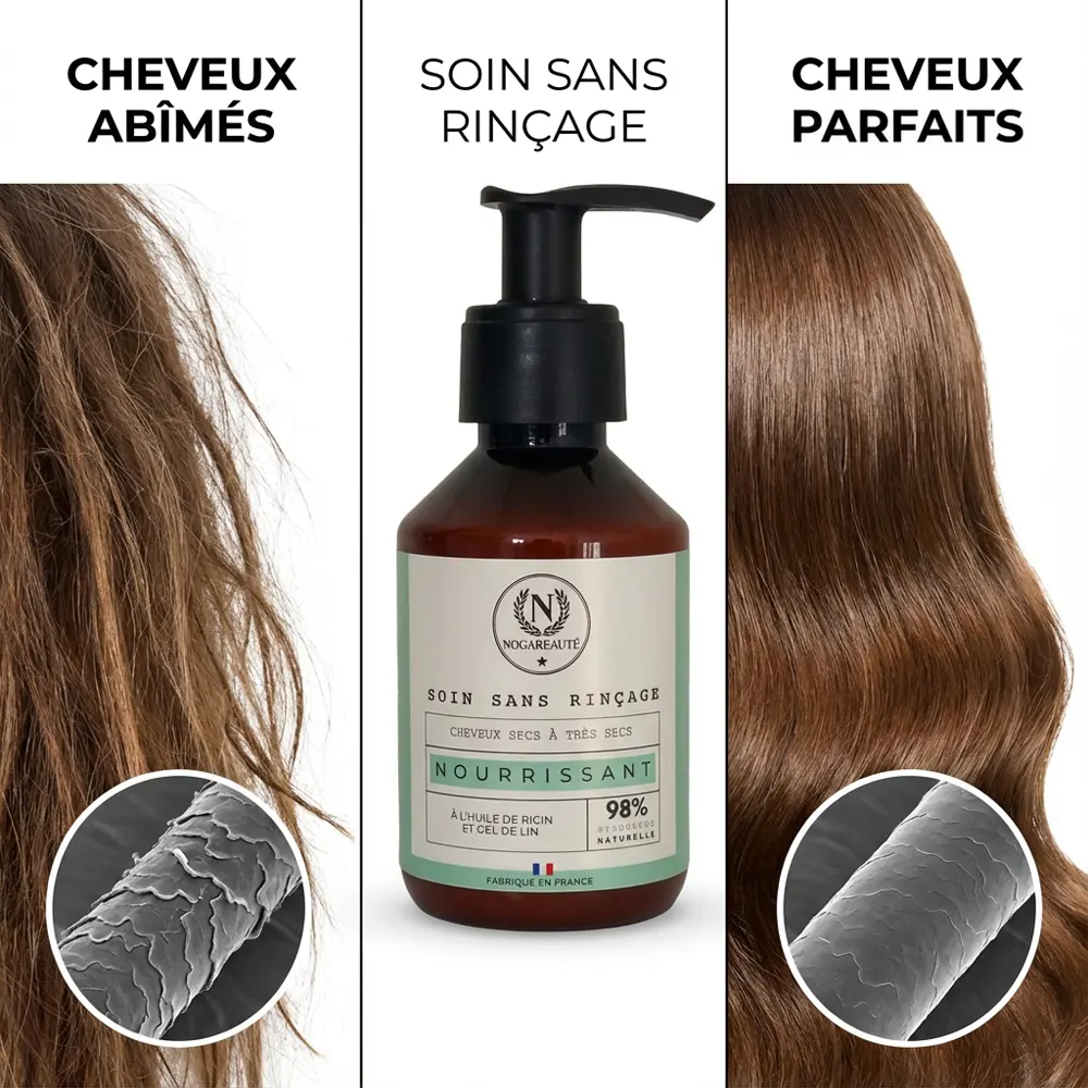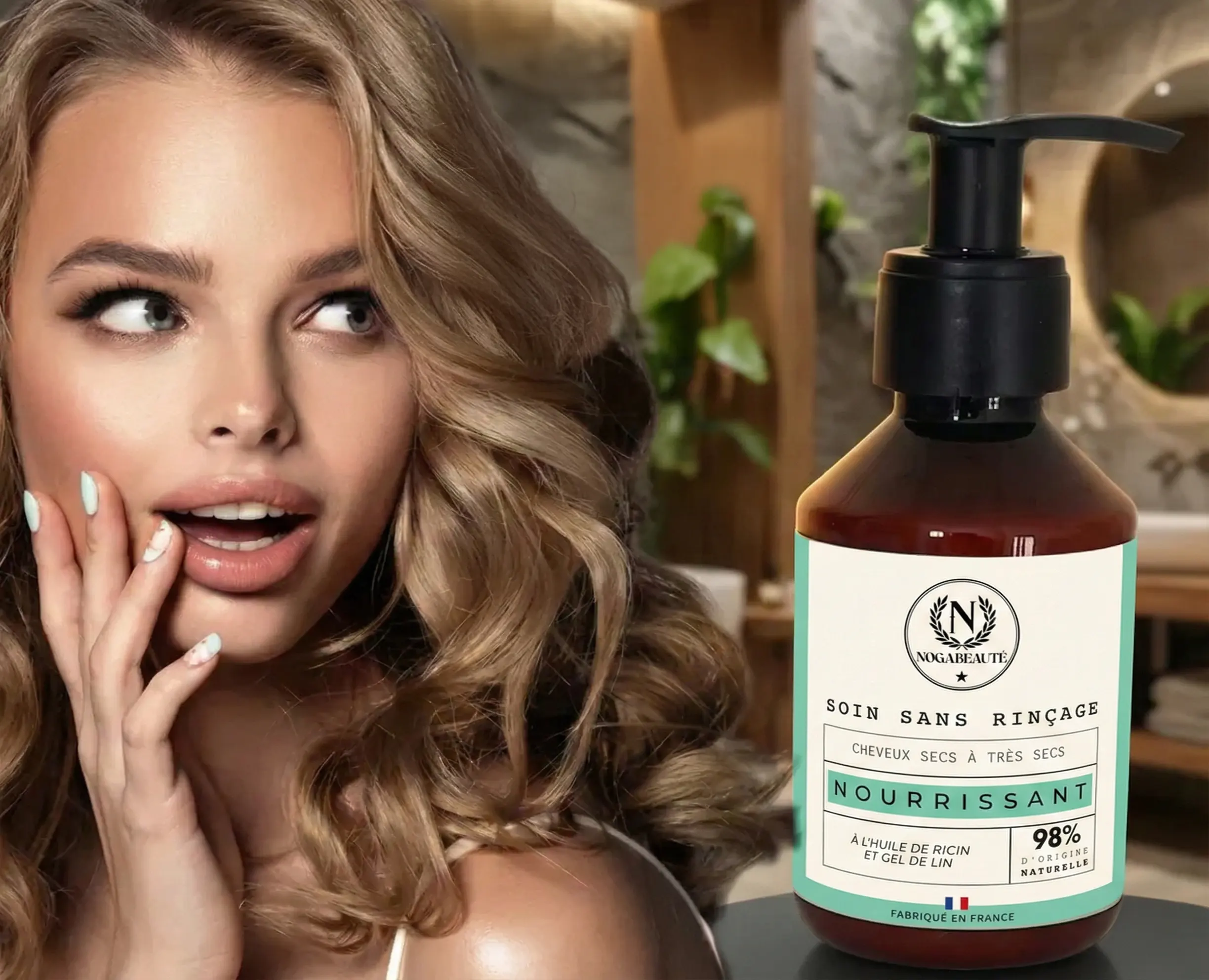 Soin nourrissant cheveux sans rinçage Nogabeauté à 98 % d’origine naturelle. Nourrit, hydrate et protège les cheveux secs à très secs. Fabriqué en France.